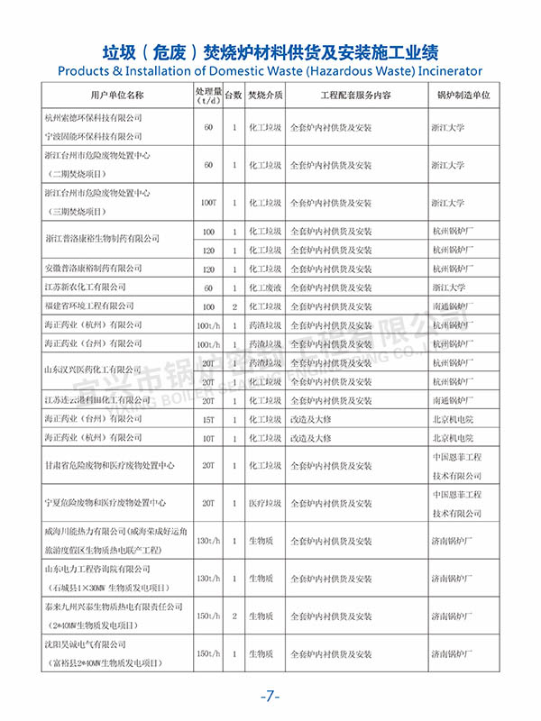 垃圾(危廢)焚燒爐材料供貨及安裝施工業(yè)績(三)